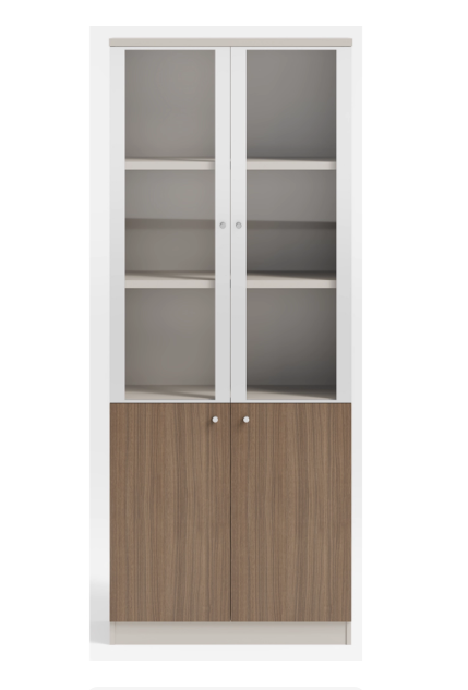 このキャビネットは、上のガラス戸セクションで書類や飾りを見栄えよく陳列し、下の木製戸セクションでプライベートなアイテムをスッキリ収納。ミニマルなデザインは、オフィスの書庫としても、リビングの収納棚としてもピッタリ。木と白の調和がもたらす洗練された雰囲気で、空間を整然と美しく保ちます。使い勝手と見栄えを両立した、多用途な収納ソリューションの一つです。
