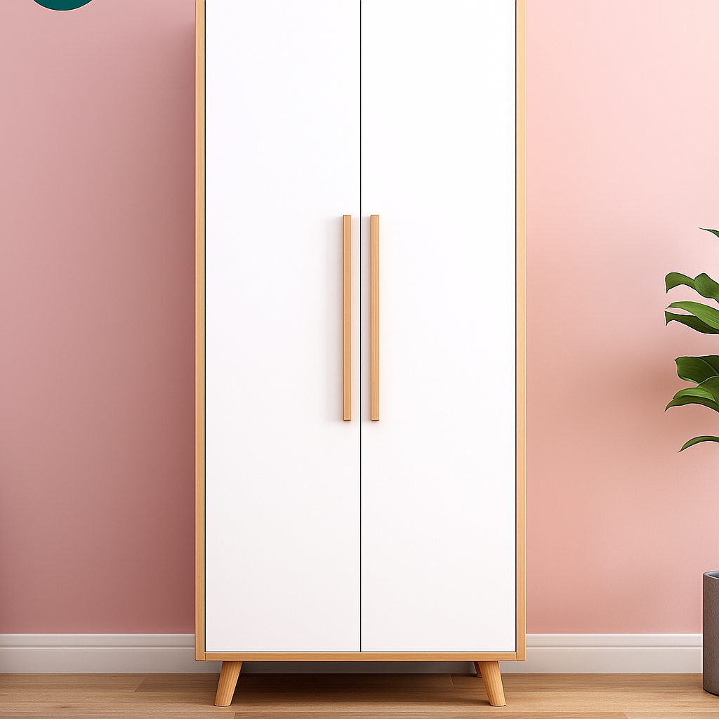 このワードローブは、純白の扉に明るい色の木製トリムを施し、
